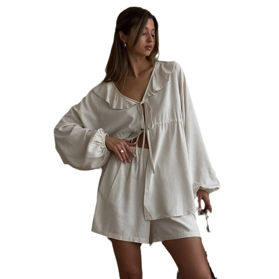 V-neck Puff Sleeve Top And Shorts Two-piece Set